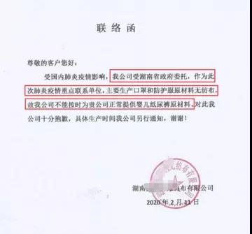 “受政委委托,作為此次疫情重點(diǎn)聯(lián)系單位,主要生產(chǎn)口罩和防護(hù)服原材料無紡布,不能按時正常提供嬰兒紙尿褲原材料”